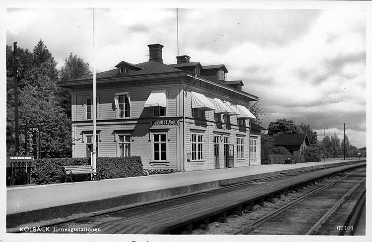 Bildnummer: G655 Kategori: Järnvägen Ort: Kolbäck Motivbeskrivning: Järnvägsstation i Kolbäck. Stationshus i trä, byggd 1875. Vid järnvägsspåret mellan Västerås och Kolbäck. Eldrift på denna bandel kom 1947.