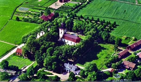 Flygfoto från 1935 över Kolbäcka kyrka med omkringliggande miljö. Till höger syns den numer rivna Klockargården. Mellan den och kyrkan vidtog den första stora utvidgningen av kyrkogården.