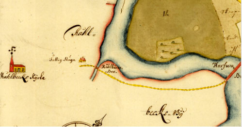 Karta med avbildning av Kolbäcks kyrka. Lantmäteriet 1721