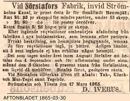 För att säkra verksamhetens framtid bildades Sörstafors AB år 1853, och företaget övertog då rörelsen. Iverus själv utsågs till disponent – en titel han bar med stolthet vid sidan av sin kronofogdetitel. Han behöll dock benmjölsfabriken och en del av jorden som sin privata egendom. Fabriken producerade benmjöl, ett eftertraktat gödningsmedel som bidrog till att öka avkastningen i traktens jordbruk. I mindre utsträckning användes det också som djurfoder eller råvara i olika industriprodukter.
