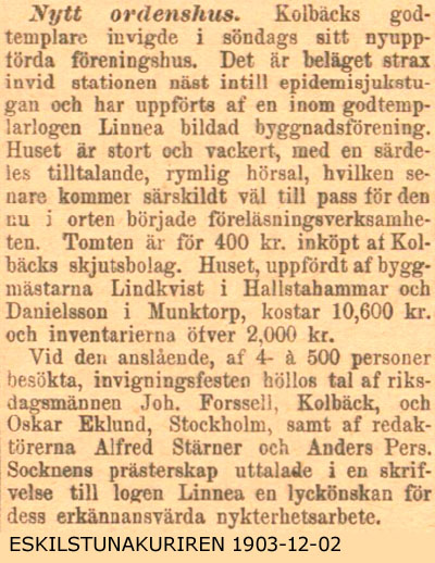 Grunden till verksamheten lades den 12 mars 1895, när en  grupp personer samlades i Haga missionshus för att bilda Godtemplarlogen Linnéa  inom IOGT. Till en början hölls mötena i en lokal i Mellanskogen i Vänsta, men  när medlemsantalet ökade beslutade man att uppföra en egen byggnad i Kolbäck.